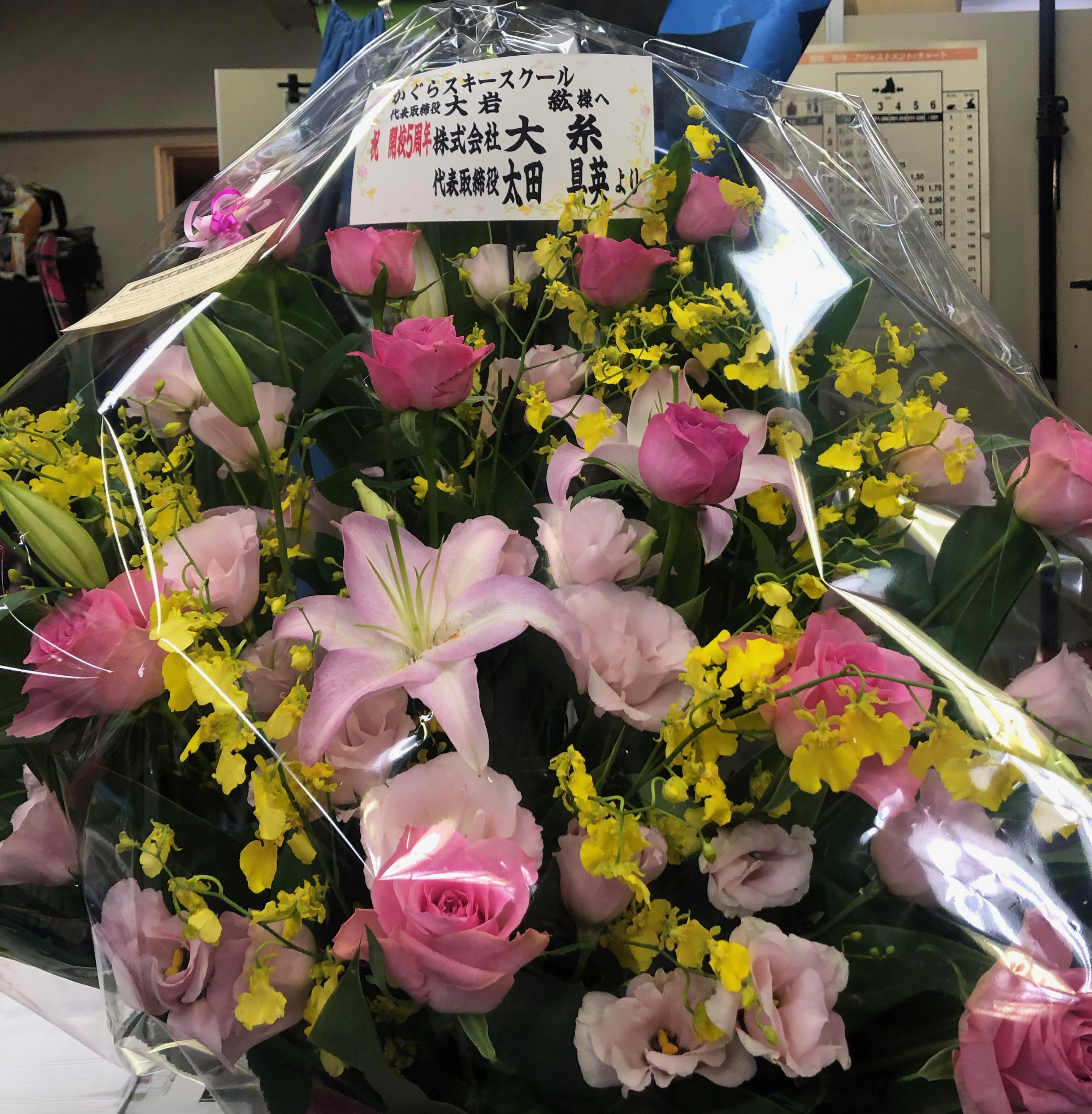 先日9日に行われた5周年パーティーの後、粟野校長の同級生であり、ロシニョールデモチームのヘッドコーチであり、白馬五竜いいもりゲレンデのオーナーである(株)大糸の太田具英様から、こんなに素敵なお花をいただきました!