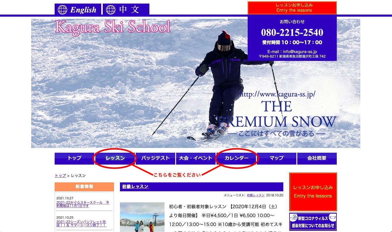 赤丸の部分をクリックしていただくと、各レッスンの説明、そしてパンフレットと同様のカレンダーがご覧いただけますので、ご予約を検討なさる時にご利用ください。