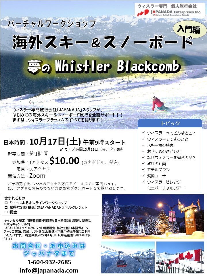 4シーズン前、かぐらスキースクールのスタッフとして前線で頑張ってくれていた庄司洋平くん。彼が 現在所属している、カナダの「ウィスラー専門の旅行会社 JAPANADA」が、現地ウィスラーと日本をつないで、バーチャルワークショップを開催します。