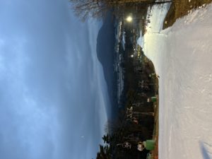 日の出前の時間帯でナイター照明の中で滑ります
